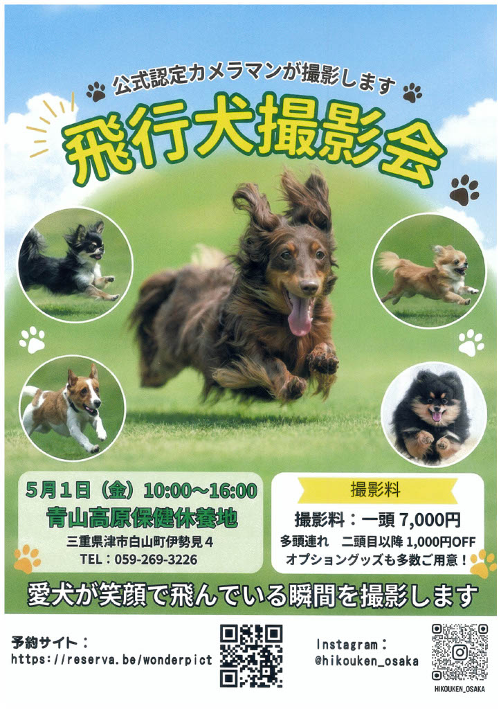 ※飛行犬撮影のご予約に関しては青山高原保健休養地にご連絡いただいても対応できません。